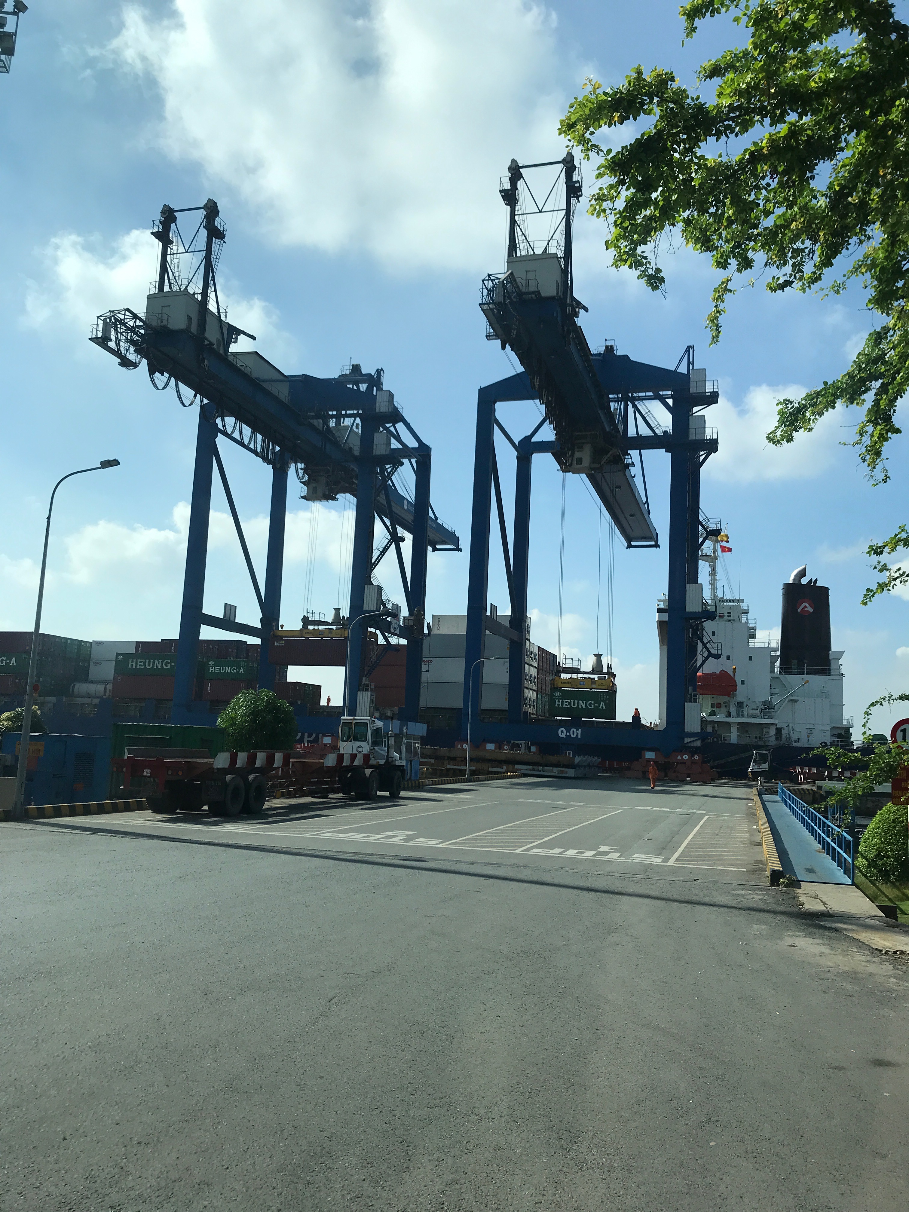 Cat Lai terminal is a port which houses the heavy machinery needed to move shipping containers onto and off of boats. Most of the goods they handle are in giant shipping containers, which are easily moved throughout the gargantuan space with cranes and trucks. At Cat Lai most containers, whether they are being imported or exported, are subject to customs. The only exception is containers which have been cleared at an offsite customs location such as the ones in VSIP. Those containers are classified as blue. Other containers are classified as yellow, which means that they require documentation in order to be cleared. The third classification is red, which requires documentation and a physical inspection. The physical inspection can include an x-ray of the shipping container, or even an opening of the crate so that an officer can inspect the property inside. In the control tower there is a schematic of the entire terminal which displays the location of each container and whether or not it is red, yellow, or blue. They way that each container is tracked is via a serial number. Whenever a container is moved, its location must be manually updated, and then the computer system will recognize the movement.