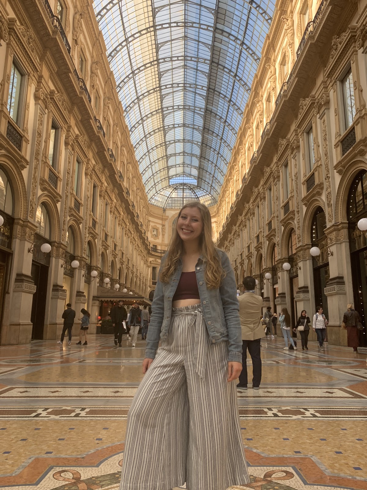 My favorite part of the day was our walking tour. Honestly, before our departure, I was a little worried about the number of walking tours in our itinerary. I didn’t want to be seen as another annoying tourist the entire trip. However, the tour was so great. Val, our guide, did an excellent job explaining the history of Milan. She took us through a beautiful part of the city with so much greenery. The city has both incredibly old and new buildings woven in between each other, Val explained, because of the bombings of World War II. The United States and Britain were responsible for the bombings, and targeted Milan because it was the city Mussolini chose to be the center of fascism. She also expressed great pride over the few skyscrapers of the city. Each new building was well thought out to be able to fit in with the already existing city architecture. We were led to the Duomo, which is a stunning church in center city. The mall next to the Duomo is beautiful, with many high end stores and stunningly detailed architecture. All that beauty comes at a price however, and Val explained that Prada pays $9 million per year for their retail space. Today really made me fall in love with Milan, and I can’t wait to see what else this incredible city has to offer.