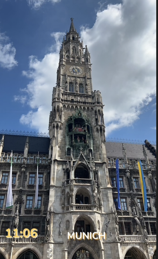 We arrived near Marienplatz and headed straight into the city to meet our tour guide. Along the way, we arrived at the perfect time to see the Rathaus-Glockenspiel (Rathaus clock tower) which has this beautiful clock that has 3 layers of characters that rotate and tell different stories. For example, one of the stories was a joust, where the 2 fighters wend head to head and battled where one of the fighters actually fell off the horse and thus lost. It was fascinating because there were so many fellow tourists waiting for the same moment and everyone was watching and cheering together, there was a sense of mutual fascination that I thought was so wholesome. After this, we found our tour guide and we headed around the city and went on a walking tour through the biggest and smallest of streets.