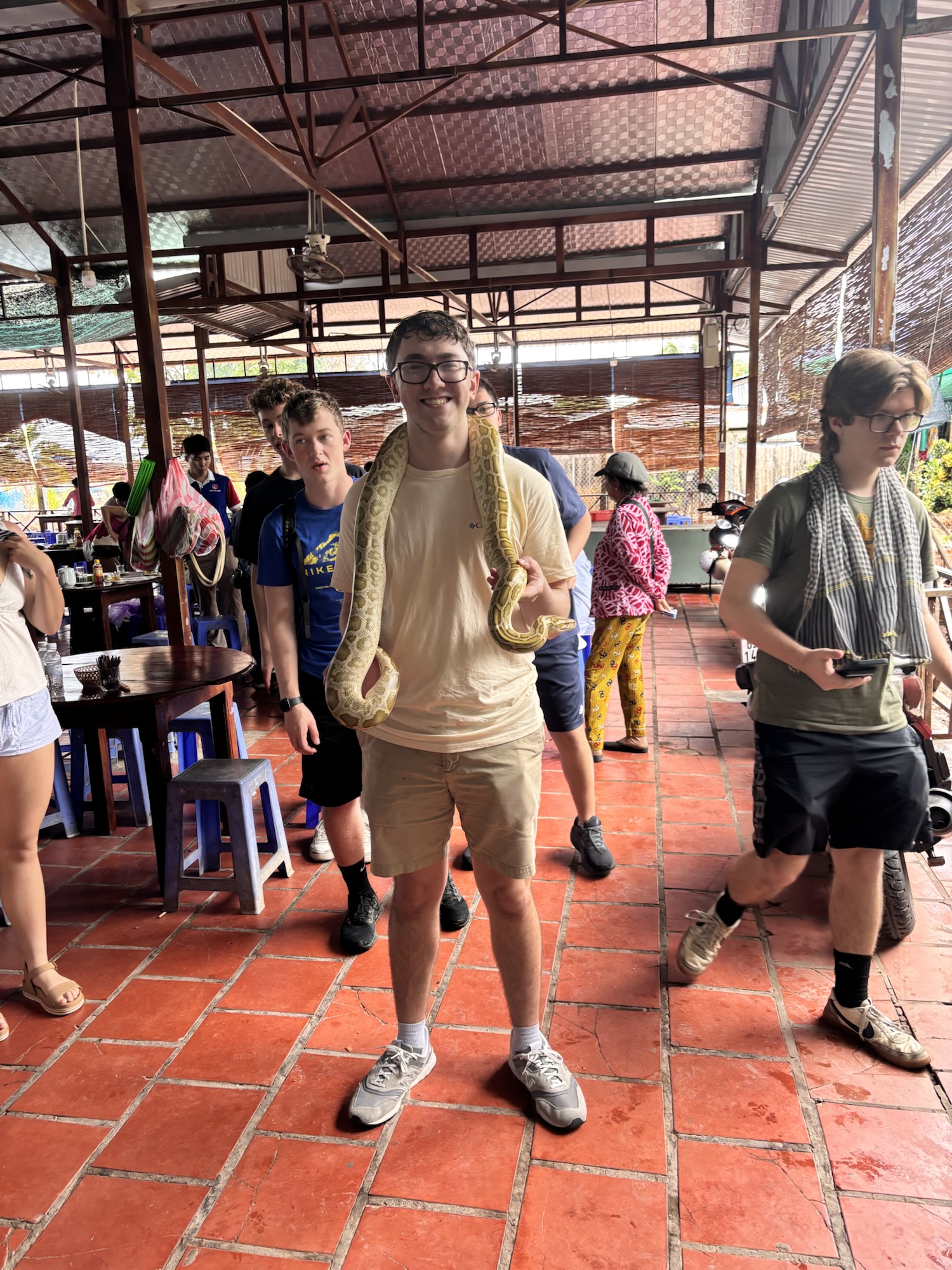 After a 2 hour bus ride, we arrived at a dock where we hopped on a boat. We traveled along the Mekong River. If we wanted to, we could take this river through Laos, Cambodia, Thailand, Myanmar, and all the way through China up to the Tibetan highlands. As evident by the fact that I have cell service to publish this post, we did not do that. Instead, we went to a local Mekong Delta town. First, we explored some shops and appreciated some sights. This area had lots of honey and coconuts, and I got to try honey tea, royal jelly, and fresh coconut candy. All of these were indescribably fresh and delicious. I felt noticeably better after the fare I had here, as it was all also very healthy. We got to hold the bees and also some pet snakes.